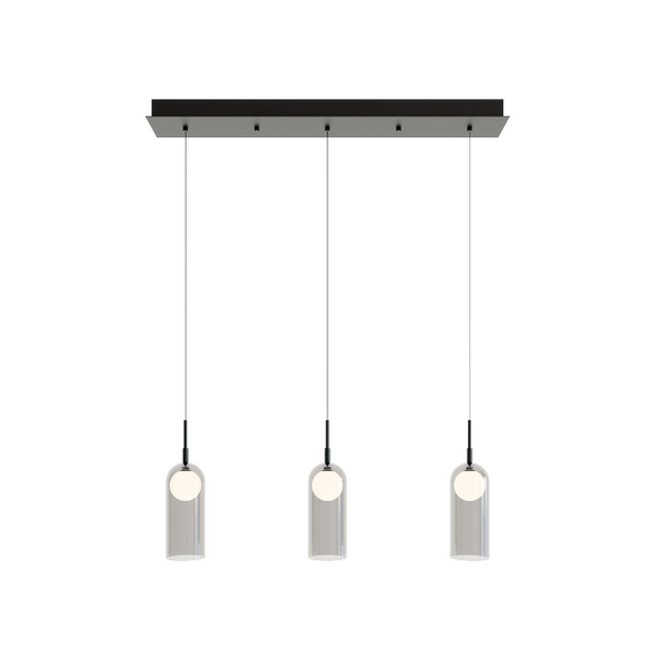 Shimmering white glass orb inside a smoke outer glass diffuser defines this linear multi port LED pendant.