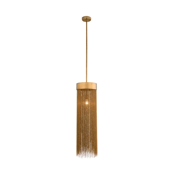 A design derivative of some of our most favored sconces this pendant exudes Hollywood Regency style. Artistically dangling from a thick brass band are rows of delicate vintage brass chains that are almost jewelry-esque.