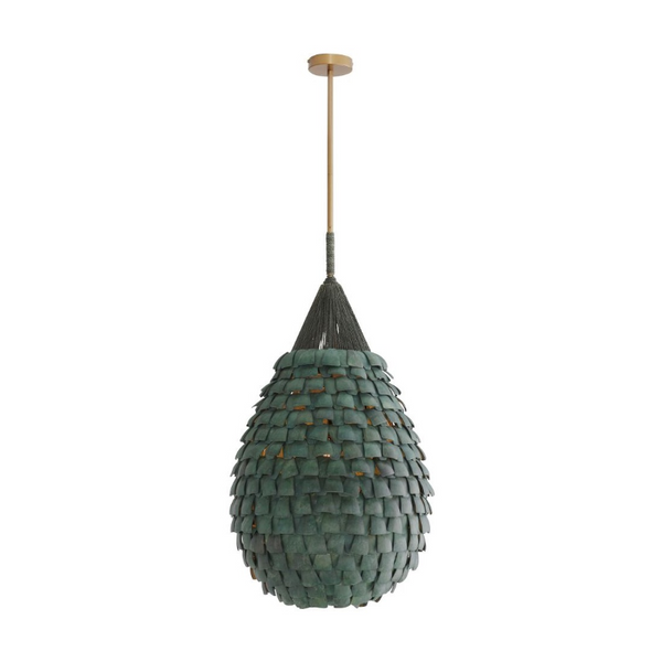 Shingles of eucalyptus hue-stained coco shells are layered for a fish scale effect on an armature of antique brass-plated iron. Suspended from strands of dark eucalyptus-stained abaca rope, the Ferndale style is anchored by an antique brass iron pipe finished with carefully wrapped details. Finish will vary.