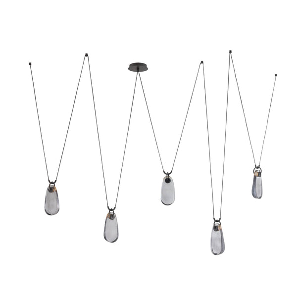 Dripping gracefully from bronze-plated iron supports and black fabric cords, this fixture creates a striking sense of motion enhanced by their flexible structure. Multiple pieces can be arranged together at staggered heights for especially dramatic displays, making the design both decorative and highly functional across a range of interiors.