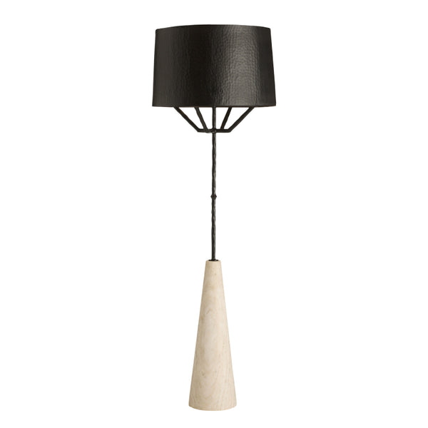 This forged natural iron and white marble floor lamp embodies innovative sculptural style. Extending from the conical base, natural iron arms appear to support the matching shade. Finish will vary.