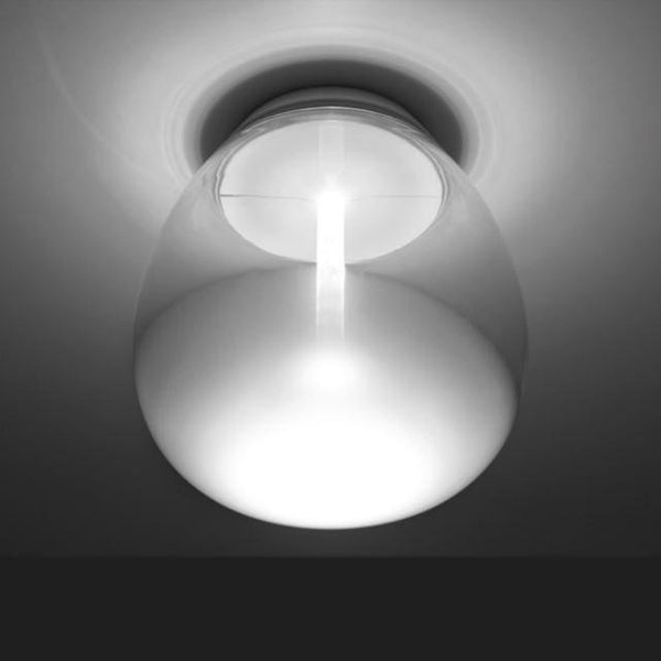 Ceiling/wall mounted luminaire for diffused lighting. Base in painted white die-cast aluminum. Diffuser in handblown glass, clear towards the ceiling/wall and frosted at the bottom to allow reflection of the light without glaring and without losing efficiency.