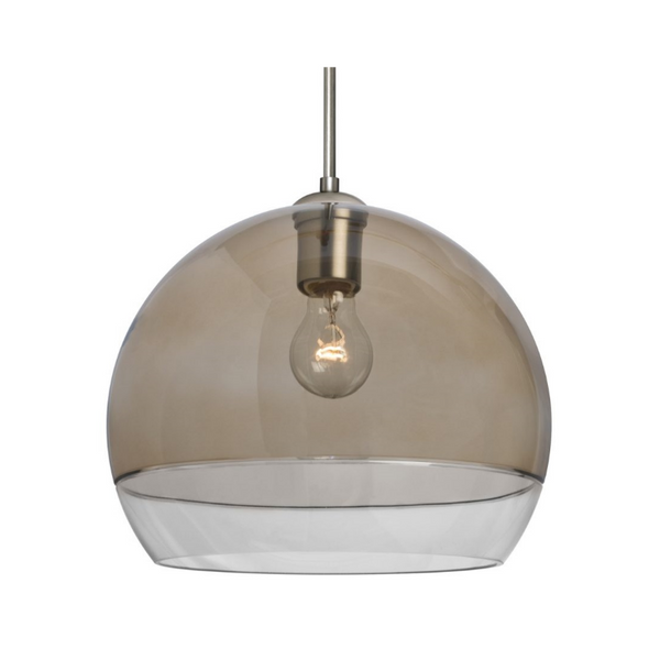 The Ally Amber Pendant is a contemporary design composed of a transparent Amber globe glass, with a clear bottom that is separated by an interesting cut perimeter line. The play of light through the cut ellipse and bottom clear portion makes for a pleasing optical affect, enhanced by the exposed light source positioned inside the shade.