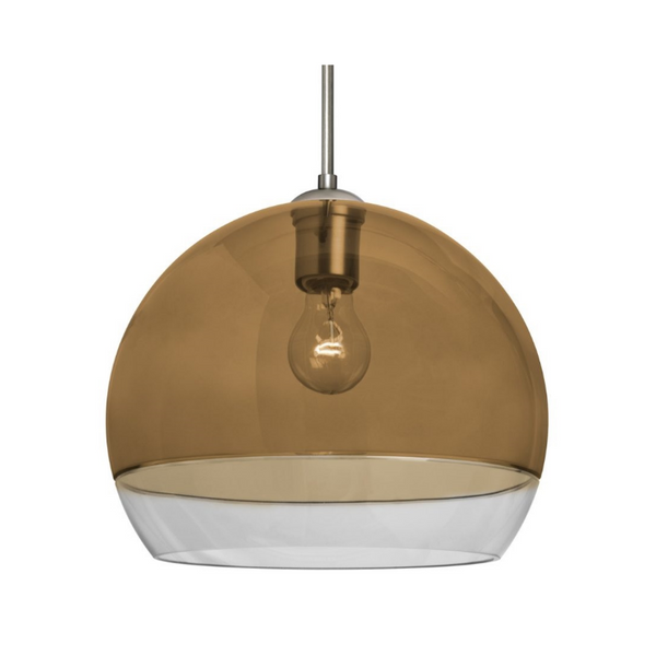The Ally Amber Pendant is a contemporary design composed of a transparent Amber globe glass, with a clear bottom that is separated by an interesting cut perimeter line. The play of light through the cut ellipse and bottom clear portion makes for a pleasing optical affect, enhanced by the exposed light source positioned inside the shade.