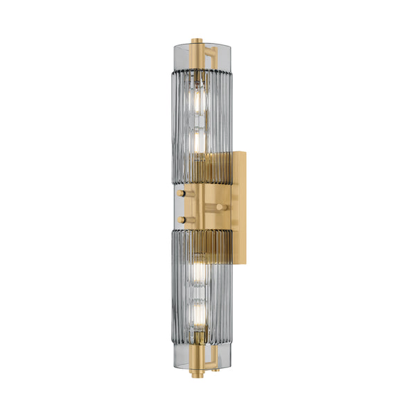 The Duoro sconce is composed of totemic sections that make a shimmering sculptural statement on the wall. As light diffuses through the clear smoked piastre glass, the shades cast a warm glow that softens the edges of your relaxation space.