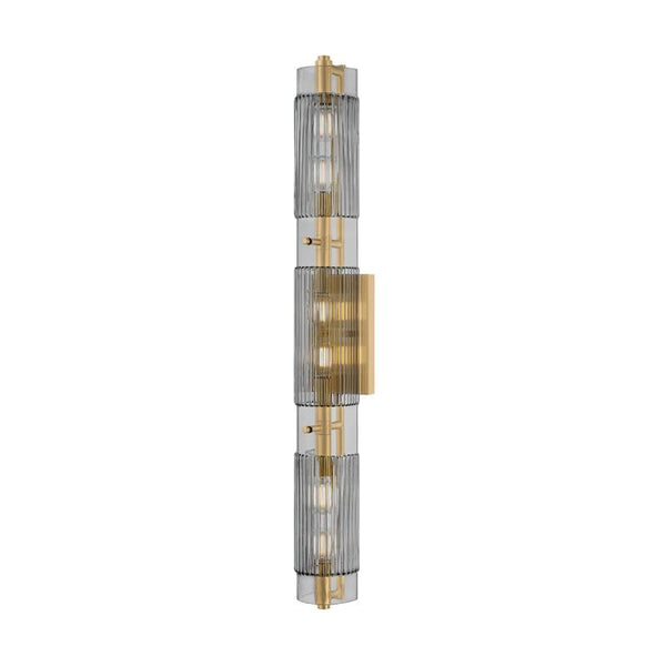 The Duoro sconce is composed of totemic sections that make a shimmering sculptural statement on the wall. As light diffuses through the clear smoked piastre glass, the shades cast a warm glow that softens the edges of your relaxation space.