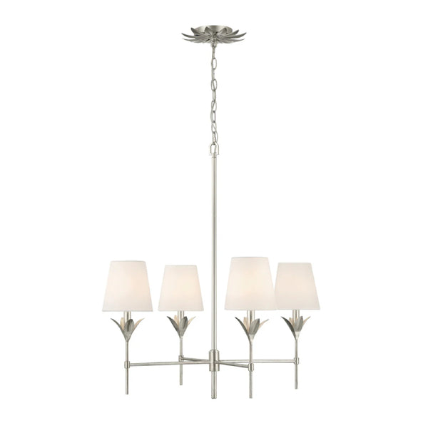 The Broche 4 Light Chandelier embodies a harmonious blend of traditional and modern elements. This fixture exudes timeless elegance with its candelabra-style frame and white linen shades.