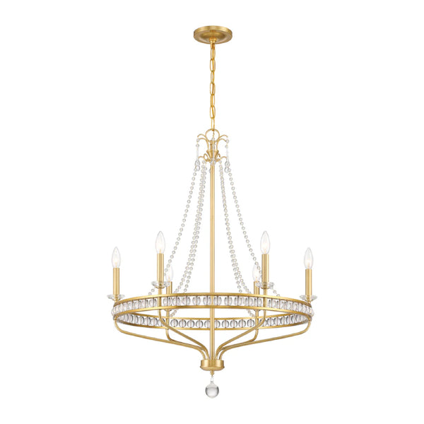 The Seville collection presents a modern take on a classic early American design. Glass balls gracefully cascade downwards, connecting to a circular gold metal framework that encases additional glass within the structure.