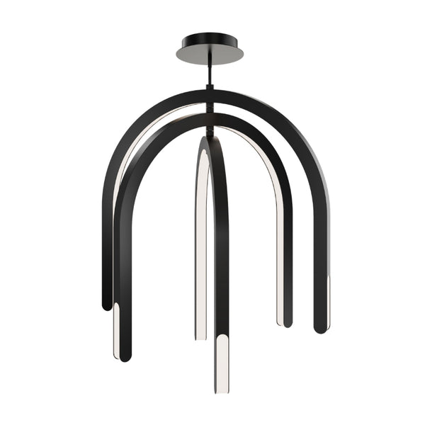 Movable arches lined with light connect on a center stem. Adjust as desired to fit your space.