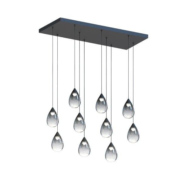 Suspended from slim cords, drops of blown glass encase a recessed LED light source casting light along the thick bottomed glass. Available in Polished Chrome with clear glass or Matte Black with Mirror Smoked Glass, this simple design adds a statement to light.