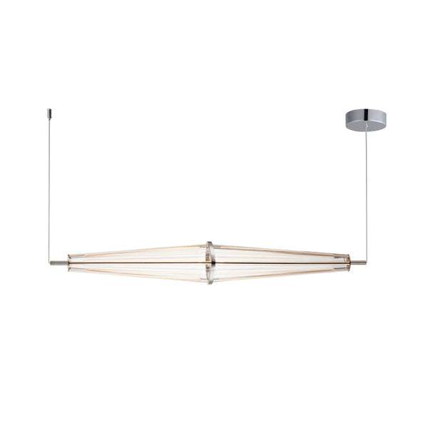 A arrangement of stainless steel and light guided acrylic form elongated rhombus shapes discreetly lit by LED. On the larger size pendants an additional aircraft cable kit is provided so that you can mount the pendants either vertically or horizontally at various angles. Finished in Polished Chrome, these pendants are out of this world.