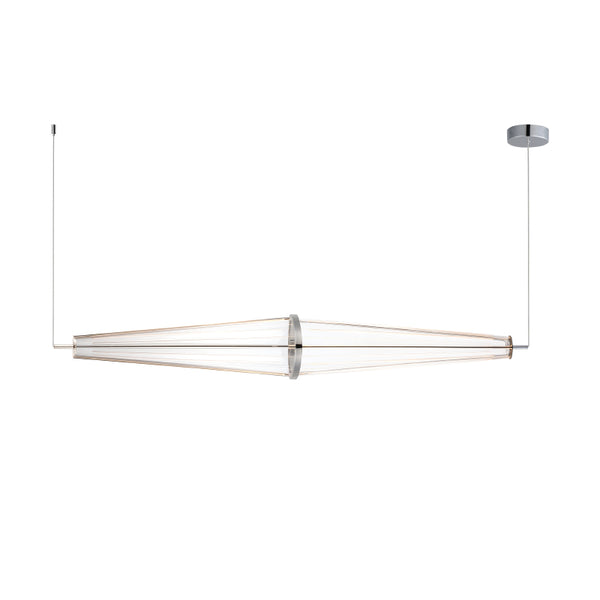 A arrangement of stainless steel and light guided acrylic form elongated rhombus shapes discreetly lit by LED. On the larger size pendants an additional aircraft cable kit is provided so that you can mount the pendants either vertically or horizontally at various angles. Finished in Polished Chrome, these pendants are out of this world.