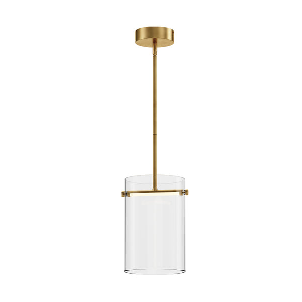Modern, Clear glass cylinders suspended by streamlined pole structures that brightly illuminate surfaces below with high powered integrated LED. Select from two finishes, Black or Gold, and two sizes of pendants, 9 or 12.5 inch diameters, as well as a coordinating wall sconce.