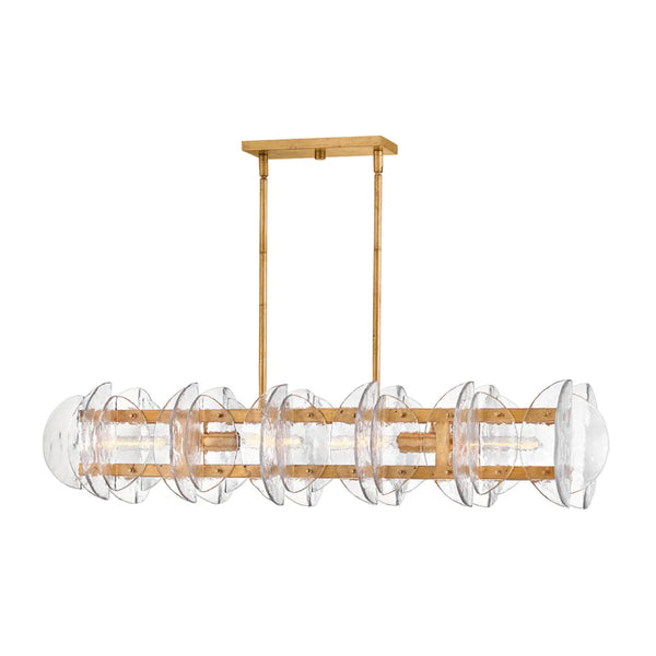 Opulent folded panes of textural water glass surround Seraphina’s glamorous, Distressed Brass frame, creating varied refractions and softly diffusing warm illumination throughout your space.