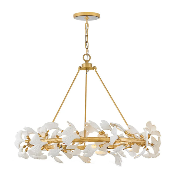 Adorned with delicate ceramic ginkgo leaves at the end of elegant hand-forged branches, Audra’s enchanting frame features a gorgeous, hammered texture finished in Deluxe Gold. Exposed LED candelabra lamps cast a magnificent warm glow.