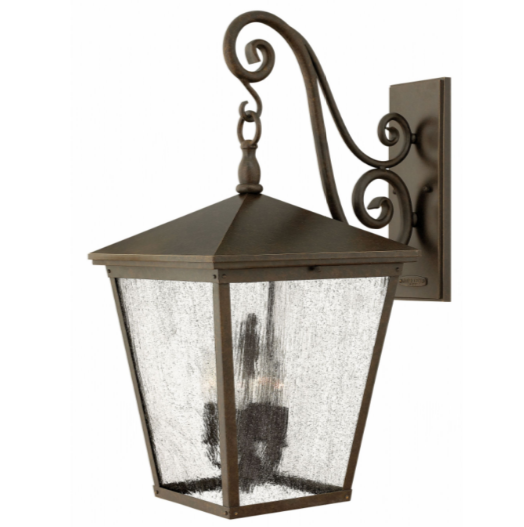 Trellis is a traditional European hanging wall lantern design in an Aged Zinc finish with clear glass or Regency Bronze with clear seedy glass. The large scroll arm detail, cast loop finial and true rivet detail create a refined elegance.