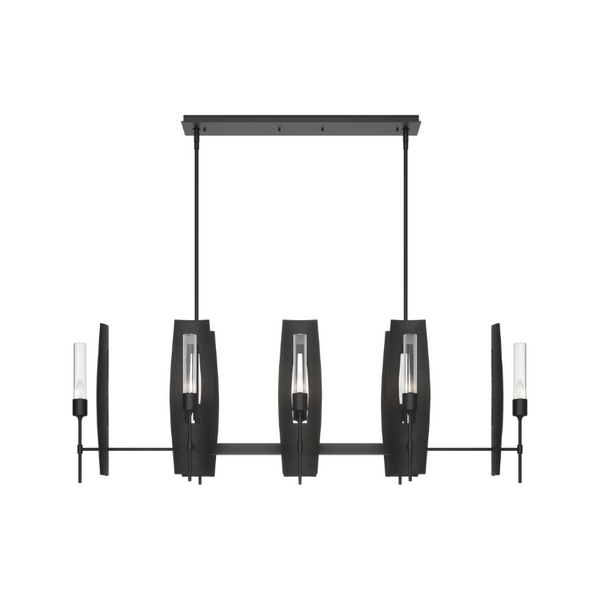 Designed by HF’s Jason Hancock, the substantial yet elegant Passage 8-Light Linear Pendant features hand-forged steel "shields" with vertical cut-outs, giving the impression of light “cast through the frame of an open window.”