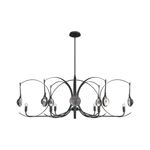 VP of Design, David Kitts, describes the Optic 8-Light Oval Pendant as having been "inspired by the ripples of light and reflections in water, this piece was designed to evoke the same feelings through thick domed glass lens and arced forge steel forms." The eight unique "lens" glass elements are made by a generational family-owned and operated pressed glass business in Ohio.