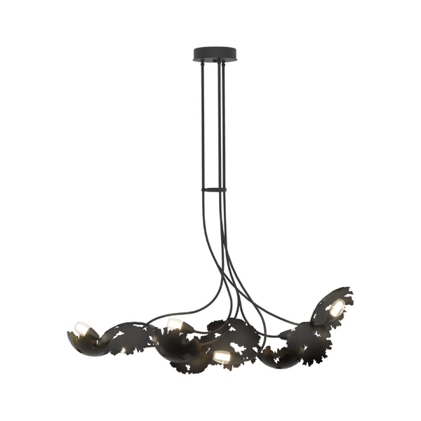 "Unlike other members of the Pangea family, the Pangea 6-Light Linear Pendant features the disintegrating of the sphere, merging the forged fragments and sinuous vining stems with bud-like glass enclosed lights" explains Designer David Martin. A sense of chaotic collision of the Pangea's supercontinental plates is visible through the placement of each hand-forged and shaped steel element along the linear plane of the fixture.