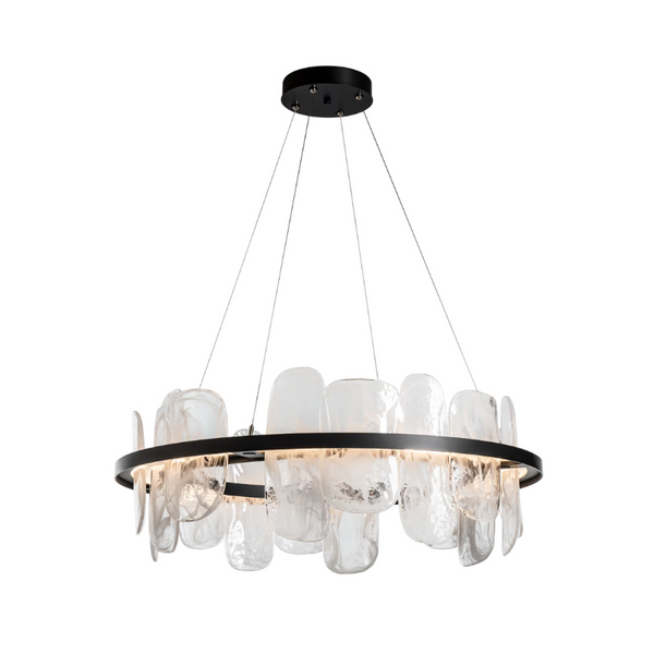 The Vitre Circular LED Pendant is ideal for a great room, grand foyer or any space that requires a focal piece. This grand lighting pendant is cable-hung and features unique, handmade slabs of clear glass with abstract white "swirls" that give depth and add beauty to this chandelier. Each vertical piece of glass looks organic in form, yet is slotted into the LED light-guide which provides a wash of up-and-down light.
