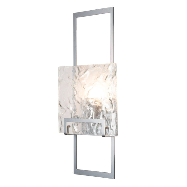 A tall, open rectangular piece of steel holds a large clear, textured glass square panel giving the Geo Sconce an angular yet distinguished allure. Very geometric in design, with clean simple lines, the Geo adds a touch of modern style to any space.