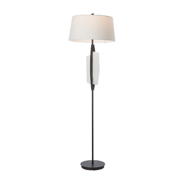 A stunning mix of materials, the Volterra's central steel element is pierced by an intersecting natural stone. The alabaster's rich allure is created by the translucency of this lustrous material. Even the smallest detail of the lamp's finial was not overlooked in this stunning floor lamp created by designer Paul Marr Hilliard.