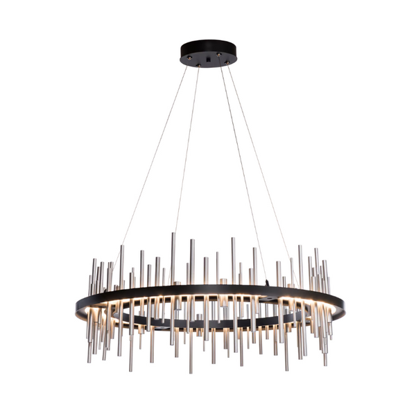 The Circular Cityscape Pendant is a stunning addition to the Cityscape collection of fixtures by Hubbardton Forge. Evoking the imagery of skyscraper silhouettes reflecting upon the waterfront, polished aluminum rods are washed in up-and-down light as they pass through a large circular LED light guide to “reflect” elegantly on the other side. With a choice of accents, this large pendant offers an amazing "city view" no matter where you live