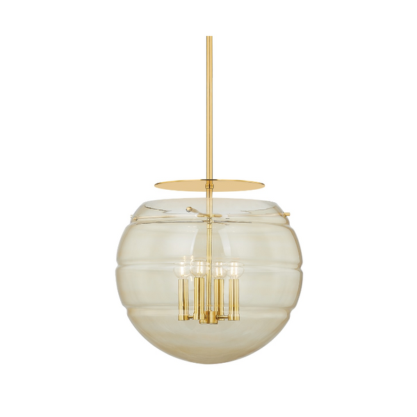 A classic lantern receives a contemporary update in the form of Gill. The central candle cluster and Aged Brass framework feel historical, while the bubble-like shade points toward the future. A champagne swirl glass technique has been applied to the sphere, adding to the dynamic energy of this pendant.