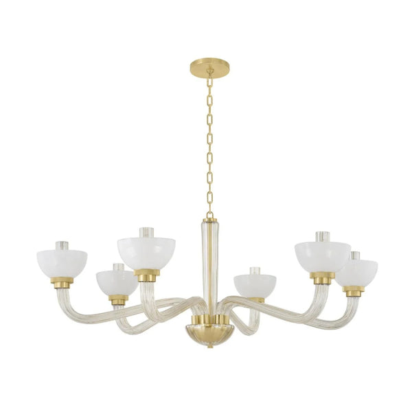 Vintage-inspired shaping, layered glass, and sophisticated finishes elevate the surprising silhouettes of the St. Lawrence family. Offering contemporary interpretations of classic motifs, the fluted champagne glass branches extend into upturned bowl-shaped opal seedy glass shades.