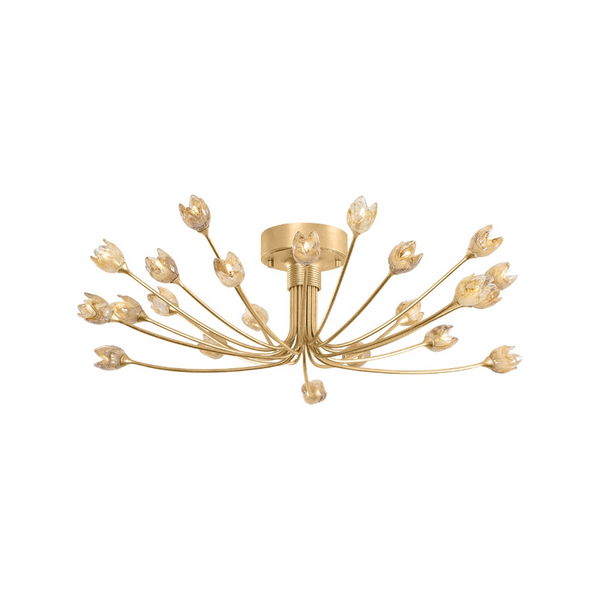 The sprawling stem-like arms and petite champagne piastre glass shades of Falkirk extend like delicate snowdrops in bloom. A Vintage Gold Leaf framework supports this whimsical close-to-ceiling fixture, adding a glamorous note. Available in two sizes, Falkirk creates a fresh, inviting statement overhead. *Fixture may only be installed as shown in picture.