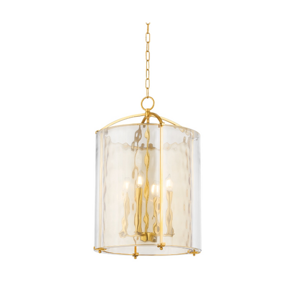 Resembling the fluidity of flowing water, this dynamic pendant light features either a light champagne or clear water glass shade. As the unique glass surface gently obscures and filters light, it glows brilliantly from within. The Aged Brass framework and chain create a warm finishing touch.