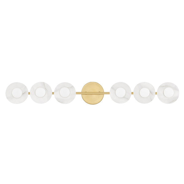 A bath bar that introduces serious elegance into a simple design by setting alabaster discs as foils against each diffuser, Elmont’s accents of stone infuse drama into the bath.