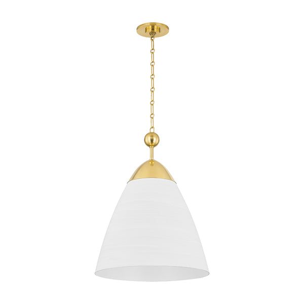 A refined bell-shaped fixture with a modern edge, Bronson features a sleek, tapered silhouette crafted from clean White Plaster. The opaque materiality and funnel shape creates a powerful downlight to fill a large area. Accented by the inviting warmth and reflective nature of Aged Brass, including a large cap and finial, it evokes an organic feel.