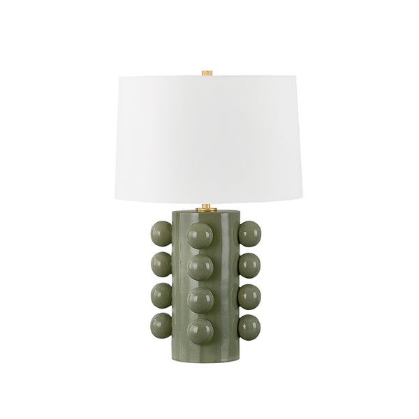 The playful, maximalist design of Roselle brings a splash of style to a table or console. Featuring a series of spherical bobbles swelling out in four directions, the smooth ceramic base is finished in a funky ceramic moss crackle glaze. A bright white linen drum shade complements the cylindrical form, balancing the lamp's whimsical energy with a clean touch.