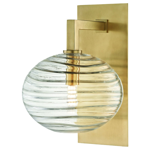 The glassmaker’s craft of using an “optic mold” to create desired interior textures and designs was invented by Roman glassworkers and flourished in Venice in the Middle Ages. Using this ancient “optic” technique, we house a glass bulb in a hand-blown oval diffuser. This diffuser is perfectly clear on the outside with a wavy horizontal pattern worked in its bulb-facing side. These interior lines are in the “optic” tradition, valued in heritage pieces such as Depression glass.