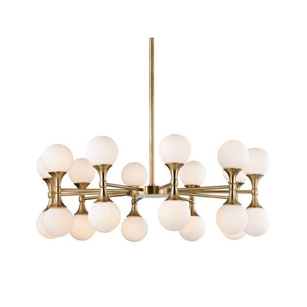Delight in simplicity and symmetry in our Astoria family. Bubbles of light balance on and balloon forth from trumpets of cast metal. Opal-etched glass diffusers poise in balanced rows, above and below, along a wheel of light, concealing warm, dimmable LED bulbs.
