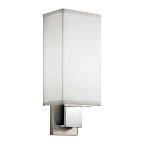 LED wall sconce from the Santiago collection is ideal for any bathroom and vanity space. Calm and energy efficient, this design uses a White Linen Fabric shade and a Matte White Acrylic Diffuser to create widespread uniform light. Featuring a playful Brushed Nickel and Chrome finished ribbon trim, you can effortlessly incorporate this adaptable design into your existing décor.