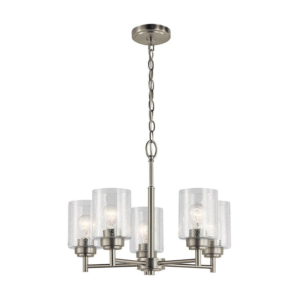 The modern Winslow™ 5-light chandelier with Clear Seeded glass shade pair beautifully with the linear arms, bringing light and dimension to a space.