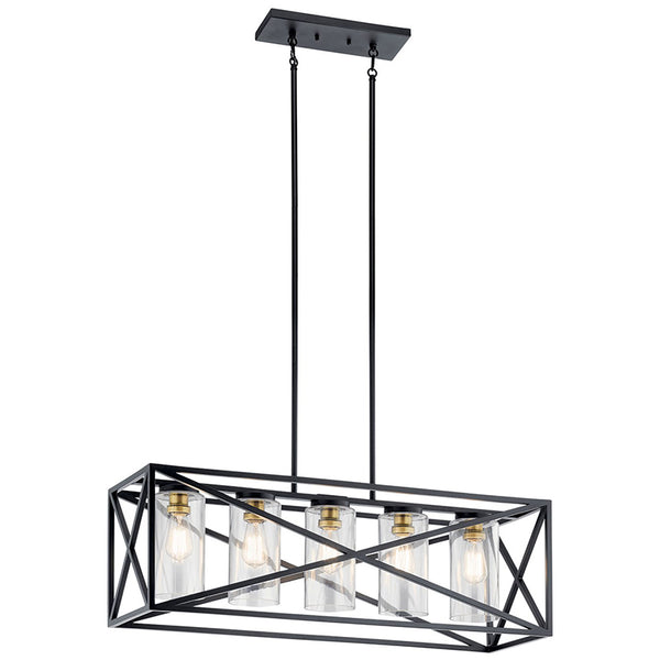 Inspired by vintage industrial shipping crates, the 5-light linear chandelier from the Moorgate™ collection features an oversized X pattern in a rich Bronze and Brass finish combination.