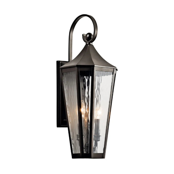 Traditional design gets a clean updated twist with this 2 light outdoor wall fixture from the Rochdale collection. The Olde Bronze tapered design stands tall and elongated giving the vertical rain glass a chance to dazzle.