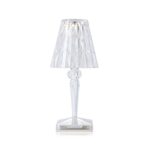 Battery is our signature small lamp shade made of transparent PMMA. Its innovation lies in the fact that it can be recharged via a USB cable, and has up to six hours battery life. This makes it easy to move: ideal for contract segments, for use on café or restaurant patios. Battery has a crystal colored cover with a faceted surface that creates fascinating plays of light, and a frame in a metallic gold or silver finish. Plus, there's also a version in different transparent shades.