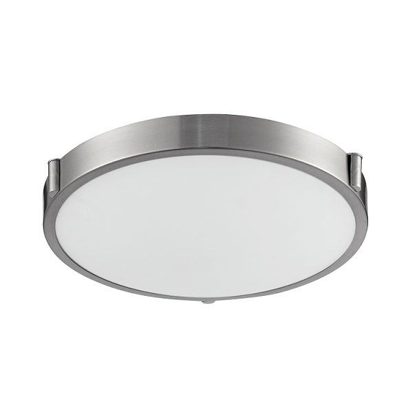 Single LED flush mount ceiling fixture with round white opal glass. Metal details in brushed nickel finish, and is equipped with our powerful 120V AC LED technology, 16W, fully dimmable.