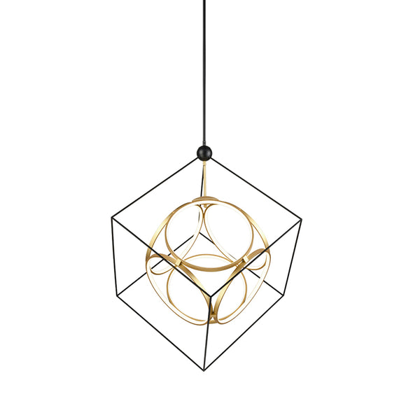 Interconnecting aluminum rings within steel frame cube. Finely textured metallic and satin powder-coat finishes. Opal silicon circular diffusers. Up and down light. Custom options available.