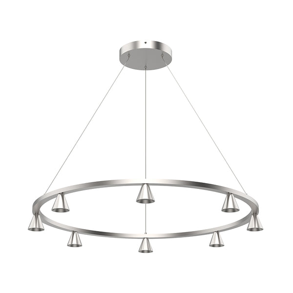 Multiple aluminum cones are connected inline and direct light downwards from the geometric linear pendant. The Dune series utilizes classic minimalist lamp shapes yet in reduced scale to elegant effect. The LED spot sources are focused by diminutive reflectors housed within the exquisitely turned shades.