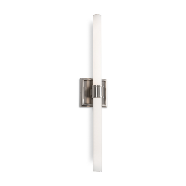 A tubular length of illuminated rod the Rona wall light is supported and clasped with a detailed cylindrical projection. The thick square outline of the attachment plate frames the lamp holder and echoes the refinement of present architectural trim.