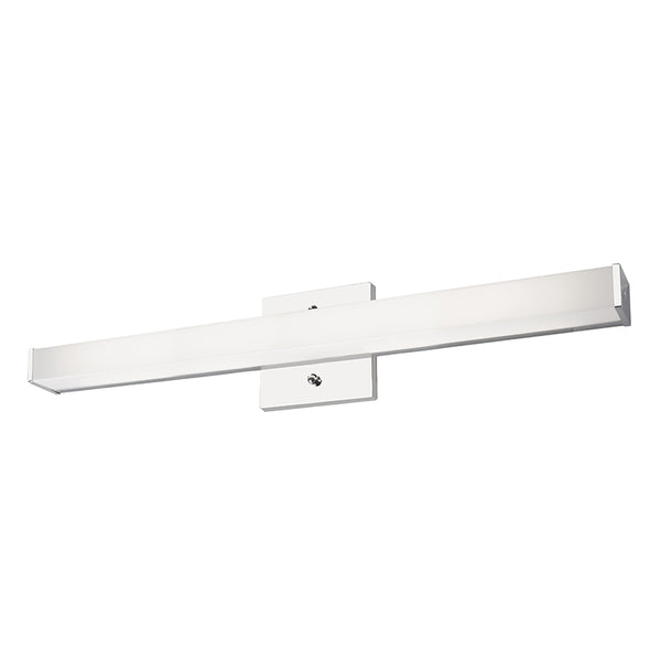 Simplistic Modern LED with rectangular shaped white acrylic finished with chrome end caps and matching canopy. Equipped with our powerful 120V AC LED technology, and may be mounted horizontally or vertically. Available in three different sizes and four different design styles.
