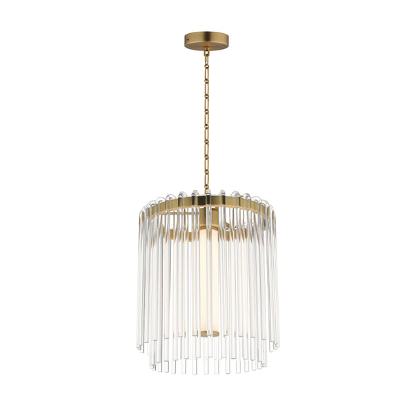 Clear glass rods elegantly curve to drape over a metal frame, encasing an integrated LED light source within. These ornamental glass rods form a luminous curtain, softly illuminated by the LEDs.