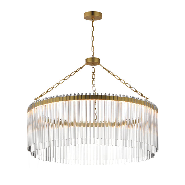 Clear glass rods elegantly curve to drape over a metal frame, encasing an integrated LED light source within. These ornamental glass rods form a luminous curtain, softly illuminated by the LEDs.