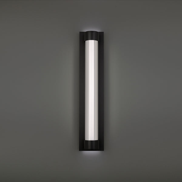 Enhance your façade with the Chyzel outdoor wall light, a polished black rectangle framing a clear column of linear rippled glass. Integrated, color temperature selectable LEDs provide textured " illumination that radiates outward, while soft up and down lighting emerges from the top and bottom of the column.