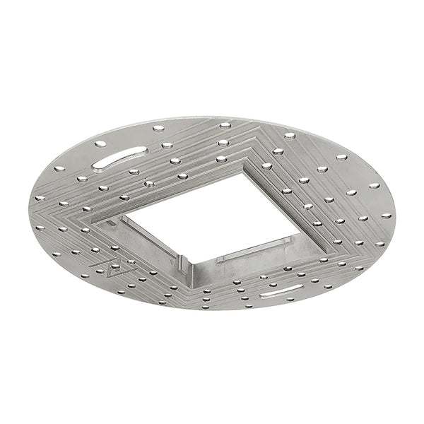 Allows 4″ Iolite PLUS square trimless to be installed even no exposed flange and no extension beyond ceiling plane. Mud ring attaches to drywall and requires professional drywall finishing.